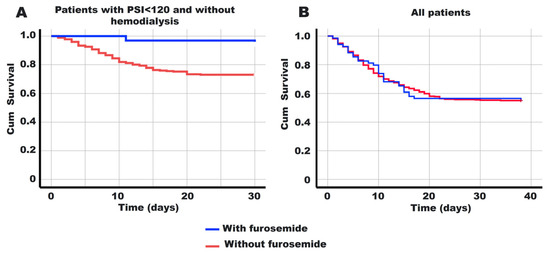 Kaplan–Meier curves for 40 days based on furosemide treatment. (A) Individuals receiving furosemide, with a PSI score <120 and without hemodialysis treatment, show a significant increase in survival time among patients compared to those not receiving the drug (p = 0.013). (B) Among all hospitalized patients, there was no significant difference in survival rates between those with and without furosemide (p = 0.994).