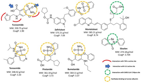 As shown in Figure 3, torasemide, piretanide, bumetanide, and zafirlukast contain sulfonamides in their structures, which may confer their inhibitory capabilities on TNF-α and IL-6. Furthermore, the presence of sulfonamides is key for binding to human albumin, enhancing their transport in the bloodstream, which could support their clinical use [13]. On the other hand, montelukast has been evaluated for its interaction with the SARS-CoV-2 Mpro site, with less sterically hindered carboxyls being able to engage with the active site effectively [36]. This information could aid in designing molecules that possess these characteristics to achieve more pronounced effects in combating COVID-19.