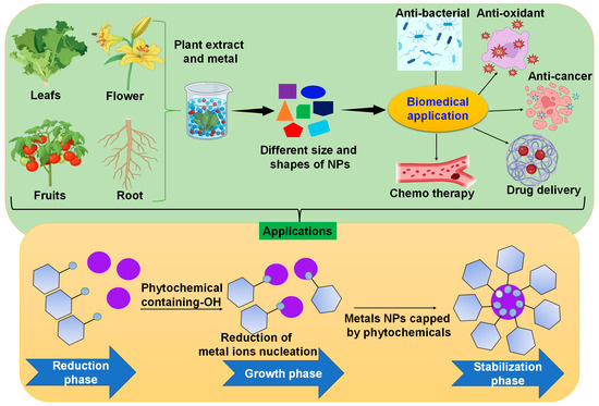 - Barathikannan, K.; Chelliah, R.; Selvakumar, V.; Elahi, F.; Rubab, M.; Sanyal, S.; Yeon, S.-J.; Oh, D.-H. Plant-based metabolites and their uses in nanomaterials synthesis: An overview. In Secondary Metabolites Based Green Synthesis of Nanomaterials and Their Applications; Springer: Berlin/Heidelberg, Germany, 2023; pp. 1–22. [Google Scholar]