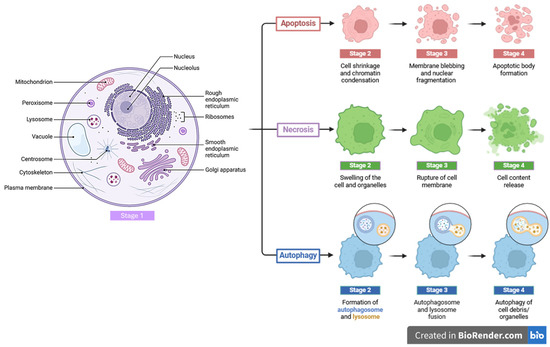 Structural overview of an animal cancer cell with its components contributing to its functionality (left). Major pathways of cell death through apoptosis, necrosis, and autophagy, which describe the main processes involved in each pathway (right). This figure was created using BioRender.com.
