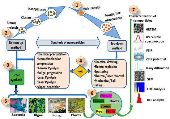 Bottom-up and top-down methods for nanomaterial synthesis. (1) Synthesis using bulk material in the top-down method; (2) synthesis using atomic structures/molecules in the bottom-up method; (3) green synthesis approaches in bottom-up methods; (4) toxic method for nanomaterial synthesis in bottom-up and top-down methods using physical and chemical approaches; (5) biological sources exploited in the bioformulation of biogenic (green) nanomaterials; (6) biological plant parts that are used in biogenic nanomaterial synthesis (7); characterization techniques to confirm the synthesis of nanomaterials. Reproduced with permission from Kah et al., Cells, 2023 [75].