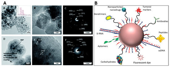 (A) Bright field TEM images and electron diffraction of bare MNPs (A–C) and of MNPs functionalized with feroxamine (D–F) [95]. Reproduced with permission from the Royal Society of Chemistry. (B) Representation of functionalized nanoparticles and different attached targeting molecules for property amelioration [96]. Reproduced with permission from the Royal Society of Chemistry.