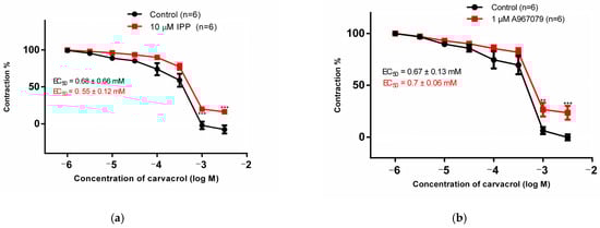 The graph shows the relaxant effect of carvacrol (CRV; 1–3000 µM) on HMA pre-incubated with (a) IPP (10 µM) or (b) A967079 (1 µM) and then pre-contracted with 1 µM PE. Values are expressed as percentage of primary PE contraction, which is referred to as 100% (mean ± SEM); (** p < 0.01; *** p < 0.001; two-way ANOVA, followed by Bonferroni test). The EC50 of the vasorelaxant effect of carvacrol was calculated for each curve, both in the presence and absence of TRPA1 antagonists.