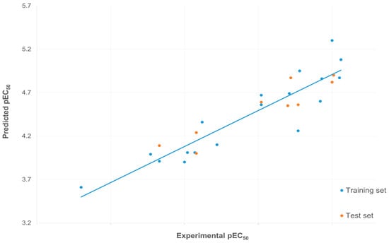 The PLS model can be considered as reliable if: R2 > 0.6; Q2 > 0.5 and RMSEE < 0.5 [,]. As a parameter of external validation, the predictive correlation coefficient () was calculated using molecules from the test set: