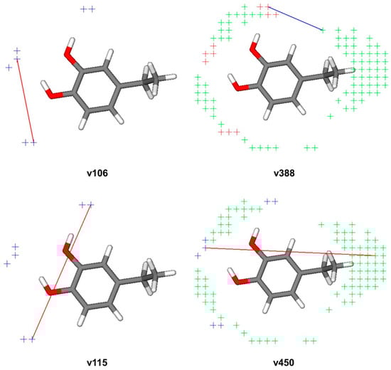 The predicted pEC50 values for D compounds were higher compared to the experimental pEC50 value for carvacrol (4.77) and slightly higher than the pEC50 values of some other compounds used to create the model. Although the validation of the model was successful, providing a reliable tool for predicting TRPA1 pEC50 values, further studies are necessary to determine the EC50 of this compound under experimental in vitro conditions. Compound D27 also showed improved activity although its structure is slightly different from other designed molecules. With the exception of D27, all other D compounds are catechols. The presence of two hydroxyl groups could result in the formation of intramolecular hydrogen bonds. However, strong hydrogen bond interactions between hydroxyl groups in catechols are maintained in weakly interacting solvents, while in strongly interacting solvents such as water, internal hydrogen bonds are lost []. As experimentally confirmed by Callear et al., the hydrogens on the hydroxyl groups in dopamine are rather oriented to allow intermolecular hydrogen bonding instead of forming intramolecular hydrogen bonds in catechols []. Compound D16 contains an aldehyde group, while compounds D94 and D98 feature alkenes. Both functional groups are highly reactive and could potentially bind covalently to the amino acid residues of TRPA1, particularly cysteine. making them less favorable candidates for synthesis. This risk should be taken into account and evaluated in further in vitro studies.