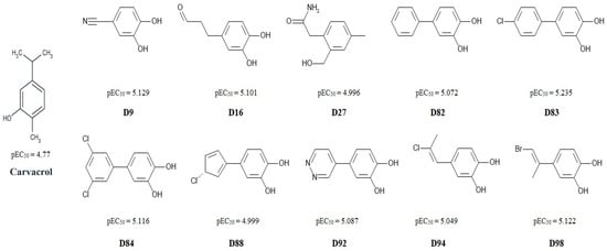 Selection of designed compounds with the highest 3D-QSAR predicted pEC50 values, along with carvacrol and its experimental pEC50 value.