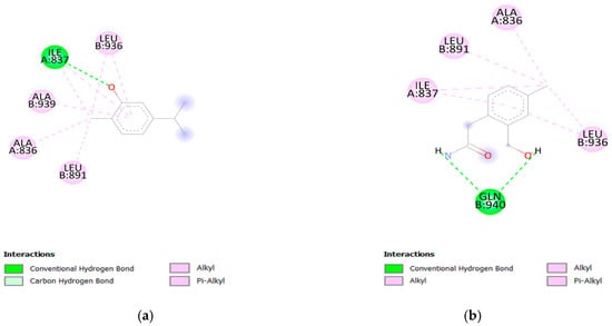 Results showed that 8 out of 10 designed molecules with better-predicted activities also have lower binding energies compared to carvacrol indicating their ability to form a more stable complex with the receptor. By observing carvacrol interactions with TRPA1, it can be seen that residues Ala (A:836), Leu (B891), and Leu (B:936) create alkyl interaction with methyl group, while Leu (B:936) in addition to this alkyl interaction and Ala (B:939) create Pi–alkyl interaction with the benzene ring. Apart from these interactions, Ile (A:837) creates an important hydrogen bond with the phenyl group of carvacrol (Figure 5). The presence of hydroxyl groups, which frequently act as hydrogen bond donors or acceptors, allows designed molecules to interact with residues in the binding pocket of the receptor via hydrogen bonds. Although molecules D82 and D84 had lower binding energies compared with carvacrol, they did not form any hydrogen bonds, which is necessary to ensure better ligand–receptor complex stability. Residues that interact with compound D27 correspond to the residues that interact with carvacrol (Ala (A:836), Leu (B891), Leu (B:936), and Ile (A:837)).