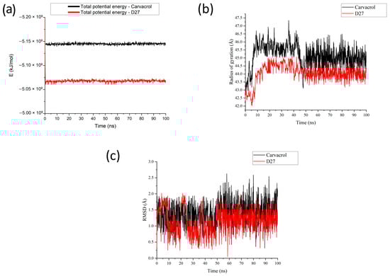 Total potential energy is a fundamental measure in MD simulations that reflects the sum of all interatomic forces, including bonds, angles, dihedrals, and non-bonded interactions within a system. A stable MD simulation typically shows the potential energy reaching a plateau or exhibiting minimal fluctuations around a baseline value. This suggests that the molecular system has reached equilibrium, an essential state for accurate biophysical analyses. Changes in the potential energy when comparing derivatives or interactions with different ligands can indicate how modifications affect the stability and reactivity of a molecule. Both carvacrol and D27 appear to reach a stable state relatively quickly as evident from the flattening of the total potential energy curves (Figure 6a).