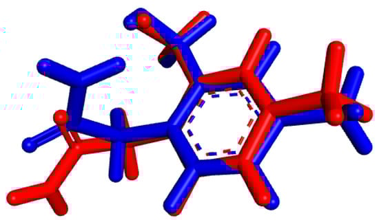 Blue represents the conformation of compound D27 from docking studies, while red indicates the conformation of compound 27 with minimum energy observed during the MD simulation.