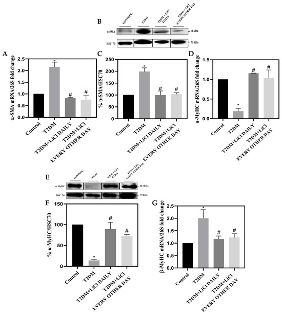 Myocardial injuries in the LV tissue samples from control, T2DM, and lithium-treated T2DM rats. (A) Bar graph showing mRNA levels of α-SMA relative to 26S. (B) Representative Western blot analysis of α-SMA and Hsc70 protein expression in heart LV tissue samples from control rats, rats with T2DM, and T2DM rats treated with LiCl daily or every other day. (C) Bar graph showing the quantification of the α-SMA Western blot. (D) Bar graph showing mRNA levels of α-MyHC relative to 26S. (E) Representative Western blot analysis of α-MyHC and Hsc70 protein expression in heart LV tissue samples from the studied groups. (F) Bar graph showing the quantification of the α-MyHC Western blot. (G) Bar graph showing mRNA levels of β-MyHC relative to 26S. (H) Representative histopathological sections of the LV stained for β-MyHC (brown color) from the studied groups. Scale bar = 100 µm. (I) Bar graph showing the quantification of β-MyHC immunoperoxidase staining. The data are presented as means ± SD with n = 5/group. Statistical significance is denoted by * p < 0.05 vs. control rats, # p < 0.05 vs. diabetic rats. The Western blot gels represent cropped bands from the same gel where more than one sample is represented and are presented for aesthetic purposes. Full pictures of the Western blots and the densitometry ratio are presented in Figure S2 and Table S1.