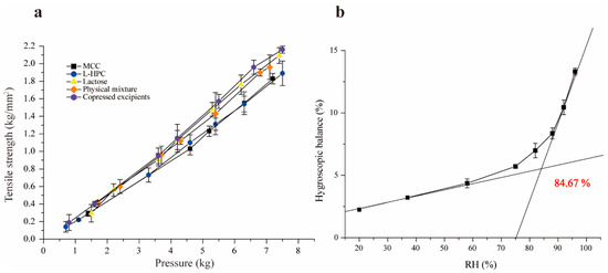 Tensile strength diagram of single excipients and co-processed excipients (a), and figure of critical relative humidity (b).