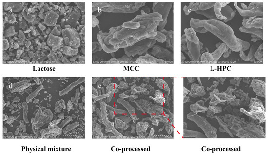 The surface morphology of the material was analyzed using SEM, with the findings presented in Figure 4. In comparison to the individual excipients and their physical mixture, the particle shape and surface morphology of the co-processed excipients exhibited notable differences. The co-processed particles formed a dense and uniform combination of MCC, L-HPC, and lactose, whereas the materials in the physical mixture were relatively dispersed with poor mixing uniformity. Additionally, the surface of the co-processed excipient particles was rough, featuring adhered recrystallized lactose particles, which enhances the fluidity of the co-processed excipients. These structural characteristics resulted in high surface porosity and increased surface area, which significantly improved compressibility and further accelerated swelling and disintegration processes.
