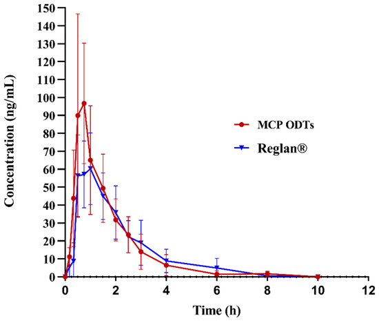Mean plasma concentration–time profile of metoclopramide after administration of 10 mg control tablets and MCP ODTs in 6 beagle dogs.