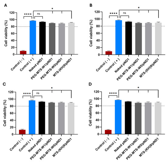 Cellular viability of human astrocyte cells ((A) 24 h, (B) 48 h) and lung smooth muscle cells ((C) 24 h, (D) 48 h) after incubation with naked pND1 and the 20% PEG–MTS–WRAP1/pND1 (PEG–MTS–W1/pND1), 20% PEG–MTS–WRAP5/pND1 (PEG–MTS–W5/pND1) and MTS–(KH)9/pND1 nanocomplexes formulated at N/P ratio of 5 (pND1 = 1 µg). Non-transfected cells were used as a positive control (Control (+)) and cells treated with ethanol were used as a negative control (Control (−)). Data were analyzed by one-way ANOVA with Bonferroni’s multiple comparison test (ns—non-significant (p > 0.05); * p ˂ 0,05; **** p ˂ 0.0001).