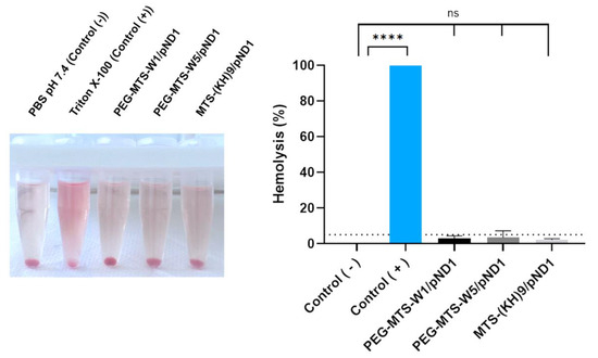 In vitro hemolysis assay using rat red blood cells (RBCs), which were incubated with 20% PEG–MTS–WRAP1/pND1, 20% PEG–MTS–WRAP5/pND1, and MTS–(KH)9/pND1 (1 µg of pND1, N/P ratio = 5). The negative control was incubated with PBS pH 7.4, while in the positive control, RBCs were incubated with Triton X-100 (1%) to provoke hemolysis. The hemolysis percentages were calculated according to Formula (1). Data are presented as mean (%) ± SD (n = 3). Data were analyzed by one-way ANOVA with Bonferroni’s multiple comparison test (ns—non-significant (p > 0.05); **** p ˂ 0.0001).