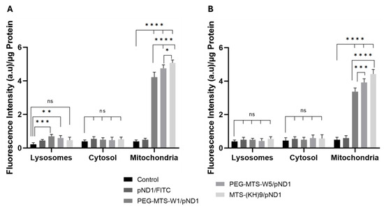 For lung muscle cells, the FITC fluorescence intensity in both lysosomes and cytosol was comparable to the FITC levels found in the control cells and no statistically significant differences (ns) were found (Figure 3B). For both cells, it becomes clear that peptide-based nanocomplexes are internalized by the cells and efficiently target mitochondria, with variations in the FITC fluorescence intensity between the three studied carriers. The mitochondria accumulation increased in the order MTS–(KH)9/pND1 > PEG–MTS–WRAP5/pND1 > PEG–MTS–WRAP1/pND1 complexes. However, in some cases the differences were low (please consult the statistical analysis available in Figure 3), which may reflect the different transfection efficiency displayed by the nanocomplexes, which may consequently influence the subsequent process of protein expression into mitochondria.