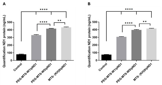 Quantification of ND1 protein levels (ng/mL) in human astrocyte cells (A) and lung smooth muscle cells (B), after 48 h of transfection with 20% PEG–MTS–WRAP1/pND1 (PEG–MTS–W1/pND1), 20% PEG–MTS–WRAP5/pND1 (PEG–MTS–W5/pND1), and MTS–(KH)9/pND1 systems (pND1 = 1 µg for all). All complexes were formulated with an N/P ratio = 5. Data were analyzed by one-way ANOVA with Bonferroni’s multiple comparison tests (** p = 0.0041 (A) and 0.0015 (B),**** p ˂ 0.0001).