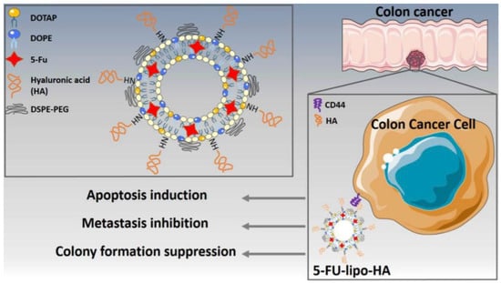 Mansoori et al. [35] developed hyaluronic acid (HA)-modified liposomes encapsulating 5-fluorouracil and tested them against a CD44-expressing colorectal cell line (HT29) (Figure 2). Liposomal nanoparticles were prepared by incorporating 1,2-dioleoyl-3-trimethylammonium-propane (DOTAP), 1,2-dioleoyl-sn-glycerol-3phosphoethanolamine (DOPE), 1,2-distearoyl-sn-glycero-3-phosphoethanolamine-N-[biotinyl(polyethylene glycol)-2000] (DSPE-PEG(2000)), and hyaluronic acid (HA) in a 1:1:1:0.5 molar ratio, respectively. Approximately 40% of the 5-FU was released from the liposomes over a period of 10 h in an acidic medium (pH 5.5, which is similar to endosomal pH), compared to 19% within the same 10 h duration at a physiological pH (7.4). DOPE plays a vital role in the structure of pH-sensitive liposomes. The exposure of DOPE-containing liposomes to acidic conditions leads to their destabilization. This is driven by the low hydration levels of DOPE’s polar head group, which transitions into a hexagonal inverted phase. This change results in the creation of non-lamellar formations that initiate the destabilization of the liposomal bilayers in acidic environments [36].