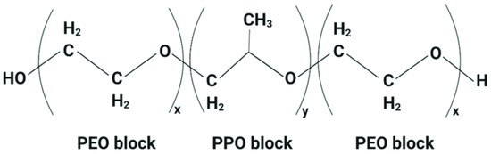 Poloxamers, also known as Pluronics, are a class of nonionic triblock copolymers composed of a central hydrophobic block of polypropylene oxide (PPO) flanked by two hydrophilic blocks of polyethylene oxide (PEO) (Figure 3). They exhibit temperature-dependent solubility and phase behavior, making them useful in thermosensitive drug delivery systems [67]. Oxaliplatin thermosensitive liposomes, consisting of DPPC, MSPC, poloxamer 188, and DSPE-PEG2000 (85:9.5:0.5:5, molar %), significantly accelerated the release of oxaliplatin when the temperature was around 42 °C, achieving a cumulative release of 90% within 10 min [68]. Thermosensitive oxaliplatin liposomes accelerated the release of oxaliplatin significantly when the triggered temperature was around 42 °C; the cumulative release of oxaliplatin reached 90% at 10 min. The antitumor activity of thermosensitive liposomes (2.5 mg/kg) was comparable to an oxaliplatin injection and non-thermosensitive liposomes at 5 mg/kg.