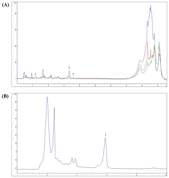 HPLC-DAD chromatograms of M. officinalis extract. (A) HPLC-DAD chromatograms with detection at 280 nm (blue line), 330 nm (red line), and 350 nm (green line). Identified compounds: 1—GALA, 2—COUMA and 3—QUE; (B) HPLC-DAD chromatogram with detection at 274 nm; Identified compound: 1—COUM.