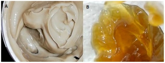 Photographs of the M. officinalis extract-based formulations: (A) MOEC; (B) MOEG.
