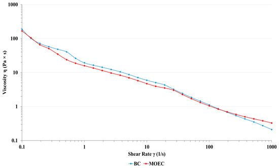 Viscosity as a function of the shear rate for the cream. The curves describe the flow behavior of the sheared and time-independent fluid. BC—cream base; MOEC—M. officinalis extract-based cream.