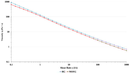 Viscosity as a function of the shear rate for the gel. The curves describe the flow behavior of the sheared and time-independent fluid. BG—gel base; MOEG—M. officinalis extract-based gel.