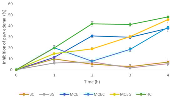 Percentage of paw edema inhibition in rats treated with the formulations. MOE—M. officinalis extract; BC—cream base; BG—gel base; MOEG—M. officinalis extract-based gel; MOEC—M. officinalis extract-based cream; HC—hydrocortisone.