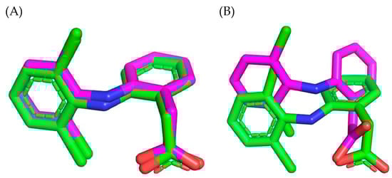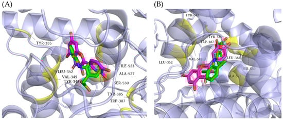 Overlapping of the native (green) and re-docked binding poses (magenta) of DIC in the active sites of: (A) COX-1; (B) COX-2.