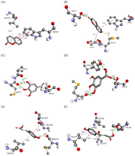 Three-dimensional display of: (A) COUM binding interactions in the active sites of (B) COX-1 and COX-2; (C) GALA binding interactions in the active sites of (D) COX-1 and COX-2; and (E) COUMA binding interactions in the active sites of (F) COX-1 and COX-2. The conventional hydrogen bonds (green dotted lines), π-sulfur (orange dotted lines) interactions, and hydrophobic interactions (pink dotted lines) are presented, as well as their bond lengths.
