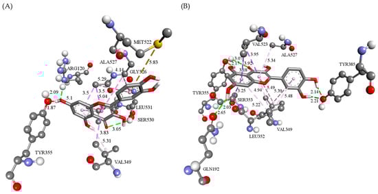 On the other hand, according to the free binding energy values, QUE exhibited a comparable binding affinity towards COX enzymes (ΔGbind = −28.37 kJ/mol for COX-1 and ΔGbind = −29.62 kJ/mol for COX-2) in comparison to DIC (ΔGbind = −33.01 kJ/mol to COX-1 and ΔGbind = −31.04 kJ/mol to COX-2). Specifically, in the active site of COX-1, the C=O group of the QUE 4H-hromen core forms an identical hydrogen bond with residue SER530 as the carbonyl oxygen atom of DIC [19]. Furthermore, QUE achieves two more non-covalent polar contacts with residues ARG120 and TYR355. The high affinity of QUE for COX-1 is also contributed to by the grid of hydrophobic interactions formed by the 4H-hromen core and phenyl ring. The residues involved in the formation of weak hydrophobic interactions are VAL349, ALA527, LEU531, and GLY526 that form π-σ, π-alkyl, and amide-π stacked interactions. Finally, the residue MET522 forms a π-sulfur interaction with the dihydroxyphenyl moiety of QUE (Figure 8A).