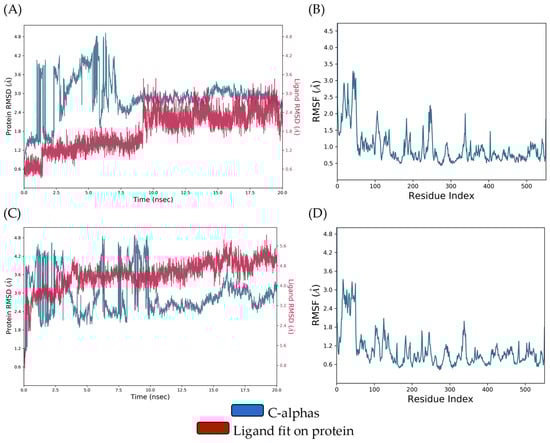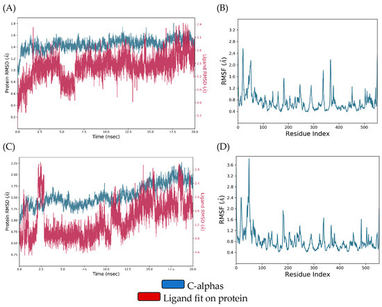 (A) RMSD of the Cα of COX-2 and DIC against the simulation time; (B) COX-2 RMSF fluctuations of the Cα against the residue index obtained for the DIC-COX-2 complex; (C) RMSD of the Cα of COX-2 and quercetin against the simulation time; (D) COX-2 RMSF fluctuations of the Cα against the residue index obtained for the QUE-COX-2 complex.
