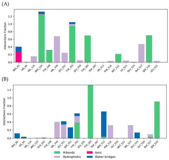 (A) QUE-COX-1 and (B) QUE-COX-2 contacts during the MD simulation. Green bars (hydrogen bonds), red bars (ionic interactions), gray bars (hydrophobic interactions), and blue bars (water bridges) are presented.