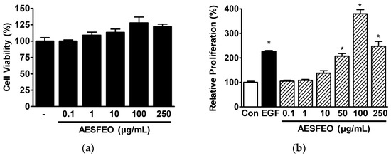 We analyzed the effects of AESFEO on the proliferation and migration responses of keratinocytes to determine whether it might influence skin wound healing. Initially, we used WST assays to investigate the effect of AESFEO on HaCaT cell viability at concentrations from 0.1 to 250 μg/mL. The results showed that AESFEO did not affect HaCaT cell viability at 0.1 μg/mL and tended to increase HaCaT cell viability at concentrations between 1 and 250 μg/mL (Figure 1a), indicating that it has no effect on HaCaT cytotoxicity. Thus, we selected AESFEO test concentrations from 0.1 to 250 μg/mL for other HaCaT cell experiments. The effect of AESFEO on HaCaT cell proliferation was assessed using BrdU incorporation assays. AESFEO significantly elevated HaCaT cell proliferation at concentrations ranging from 50 to 250 μg/mL, and the effect peaked at 100 μg/mL (at 379.66 ± 17.11% of the untreated control level) (Figure 1b). In addition, the effect of AESFEO on HaCaT cell migration was investigated using a Boyden chamber assay. AESFEO (0.1–250 μg/mL) did not influence HaCaT cell migration.