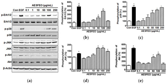Studies have indicated that MAPKs and Akt are key signal kinases that mediate the proliferation and migration of HaCaT cells [6,7,38]. We thus analyzed AESFEO-induced phosphorylation alterations in MAPKs and Akt in HaCaT cells by Western blot. AESFEO (0.1–250 μg/mL) significantly elevated phosphorylated Erk1/2 levels at 50 and 100 μg/mL (Figure 3a,b), p38 MAPK at 100 and 250 μg/mL (Figure 3a,c), and JNK at 50–250 μg/mL (Figure 3a,d). The phosphorylation levels of Erk1/2 and JNK peaked after treatment with 100 μg/mL of AESFEO (379.71 ± 32.03% vs. the untreated control [Figure 3b] and 173.21 ± 5.69% vs. the untreated control [Figure 3d], respectively). Furthermore, the phosphorylation level of p38 MAPK peaked after treatment with 250 μg/mL of AESFEO (385.74 ± 0.73% vs. untreated control, Figure 3c). In addition, AESFEO at 50 and 100 μg/mL significantly enhanced Akt phosphorylation, and this peaked at 100 μg/mL (355.29 ± 24.35% vs. the untreated control, Figure 3a,e).