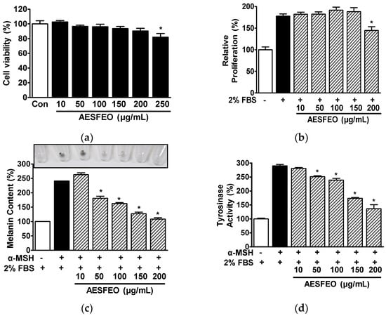 Influences of AESFEO on B16BL6 melanoma cell responses related to skin whitening. (a) Viability analysis. B16BL6 cells were treated with and without Aralia elata (Miq.) Seem. flower absolute-type essential oil (AESFEO; 10–250 μg/mL) for 48 h. Cell viability was evaluated using a WST assay (n = 3). Results represent percentages of levels in untreated cells (Con). * p < 0.05 vs. untreated cells. (b) Proliferation analysis. B16BL6 cells were cultured for 48 h with and without AESFEO at varying concentrations (10–200 μg/mL) in the presence or absence of 2% FBS for 48 h. Cell proliferation were assessed through the WST assay method as outlined in the Materials and Methods section (n = 3). Results are presented as percentages of levels in untreated controls. * p < 0.05 vs. 2% FBS alone-treated cells. (c,d) Melanin content and tyrosinase activity analysis. B16BL6 cells were cultured for 48 h in media containing 2% FBS with and without 200 nM α-MSH, along with AESFEO (10–200 μg/mL) or without it. Melanin contents (c) and tyrosinase activities (d) were assessed following the procedures outlined in the Materials and Methods section (n = 3, respectively). Top photo of panel c: representative result image. Data are presented as mean percentages ± SEMs of 2% FBS control levels. * p < 0.05 vs. cells exposed to α-MSH alone and 2% FBS.