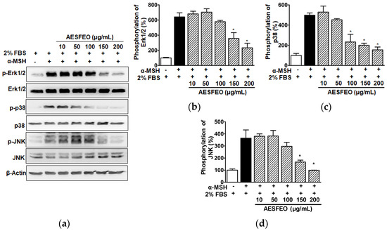 To determine whether AESFEO affects MAPKs known to be involved in melanogenesis, we analyzed the effect of AESFEO (10–200 μg/mL) on Erk1/2, p38 MAPK, and JNK phosphorylation in B16BL6 cells exposed to α-MSH (200 nM) in the presence of FBS (2%) by Western blot. Treatment of α-MSH-stimulated B16BL6 cells with AESFEO significantly attenuated Erk1/2 phosphorylation at 150 and 200 μg/mL (Figure 6a,b), p38 MAPK phosphorylation at 100–200 μg/mL (Figure 6a,c), and JNK phosphorylation at 150 and 200 μg/mL (Figure 6a,d). In all cases, 200 μg/mL AESFEO had maximal inhibitory effect.