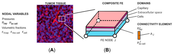 (A) Image (10×)of tumor tissue with capillary vessels stained using CD31 (red). (B) Composite smeared 2D finite element with 4 nodes and 3 physical domains: capillary, extracellular space, and cells. Fluid flow from the capillaries to the extracellular space is modeled by nodal connectivity elements, with the cross-sectional area equal to the surface (AJ in the figure).