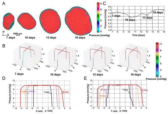 In Figure 4, pressures within the tumor at 7, 10, 13, and 16 days are presented. Pressures were determined through interpolation from the previous time point’s mesh to the subsequent time point’s mesh, ensuring that all necessary values for finite element analysis were available at the current time point. Figure 4A shows the pressure maps obtained using our in-house CAD software and finite element analysis, while, in Figure 4B, pressure values are plotted in a 3D representation along coordinate axes x and y at the tumor center. Maximum pressure values did not vary much over the specified period. Some increase in the mean pressure was due to increases in the size of the domain with high pressure relative to the domain close to the boundary, where the pressure gradient was leaning to the zero value. The highest values were distributed along the model, starting from the center of the tumor and spreading to the boundary. These results were in qualitative agreement with those reported in [65]. In Figure 4C, the mean pressure values are plotted over time for insight into pressure evolution, while the spatial distribution of the pressure is displayed in Figure 4D,E. Since the model required geometries as well as input and output boundaries, we chose to present the data in Figure 4C and Figure 5D with an x-axis starting at 7 days (15%) and ending at 16 days (80%). However, a linear interpolation could be performed for time points prior to 7 days as well as after 16 days, but performing this interpolation required a geometry and growth trend set equal to the adjacent interval, which was an assumption not observed experimentally, and, therefore, imprecise. In both the x and y directions, pressure was the highest in the middle of the tumor, decreasing to zero at the tumor boundary. It can be seen from Figure 4C–E that pressure nonuniformly changed over time, with the values at 16 days increased with respect to the 7-day configuration.
