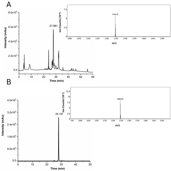(A) RP-HPLC chromatogram of crude CRT. ESI-MS spectrum relative to the peak at Rt = 27.86 min that corresponds to [M+H]+ of CRT (theoretical mass: 1246.50 Da; observed mass: 1246.65 Da). (B) RP-HPLC chromatogram of pure cyclic CRT. ESI-MS spectrum relative to the peak at Rt = 28.14 min that corresponds to [M+H]+ of cyclic-CRT (theoretical mass: 1244.49 Da; observed mass: 1244.60 Da). Detector counts of the photodiode array are reported in arbitrary units (Au).