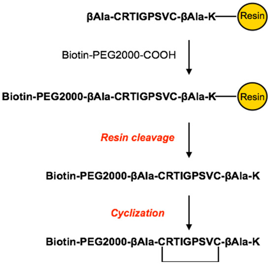 CRT (βA-CRTIGPSVC-βA-K) peptides were synthesized using the standard solid-phase-9-fluorenyl methoxy carbonyl (Fmoc) procedure and were obtained with good overall yields (50–60%). The syntheses were performed using a Biotage®Syro WaveTM peptide synthesizer (Biotage, Uppsala, Sweden). The peptide scale synthesis was 0.1 mmol. It was assembled on Rink amide resin with a substitution level of 0.71 mmol/g. The following protected amino acids were used to synthesize the peptide: