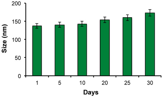 DLS periodical measurements were performed to evaluate the size evolution over time. Figure 6 shows that the hydrodynamic diameter of CRT-PEG-NEs is quite stable within the one-month detection window, with only minimal coalescence in the last 5 days (~20% radius increase).