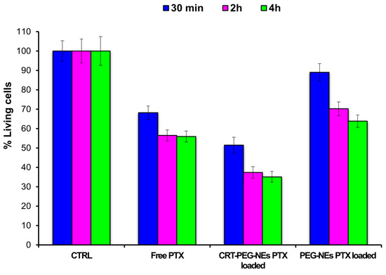 The data showed an increase of cell mortality both for free PTX and for CRT-PEG-NEs over time, with no significant difference between two and four hours. Very interestingly, it was possible to observe a significant cytotoxicity effect of CRT-PEG-NEs compared to blank (PEG-NEs). This is an evident consequence of peptide capability to accumulate the nanocarrier on the cells surface, and allow its internalization, thanks to ligand–receptor interaction. For all the incubation times, CRT-PEG-NEs exhibit an increase of cell death relative to PEG-NEs and free PTX. For instance, at 30 min of incubation, CRT-PEG-NEs exhibit an increase of 38% of cell death relative to PEG-NEs and almost 17% relative to free PTX. Considering an average over all times, relative to un-functionalized PEG-NEs, CRT-PEG-NEs induced increased cell death of 33.05 ± 4.42%.