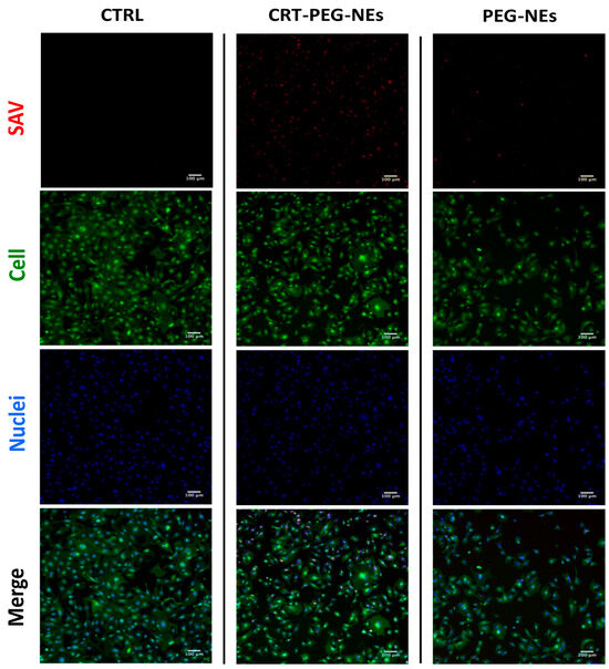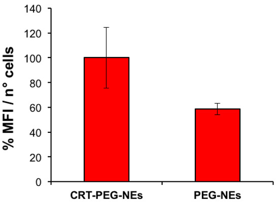 The uptake data are consistent with the previous cytotoxicity results, showing a clear fluorescence difference between CRT-PEG-NEs and PEG-NEs. No fluorescence was detected in the images of the control cells. Specifically, the fluorescence intensity of peptide-functionalized NCs was approximately 40% higher compared to the negative control. Furthermore, a small amount of PEG-NEs was detected in the cells.