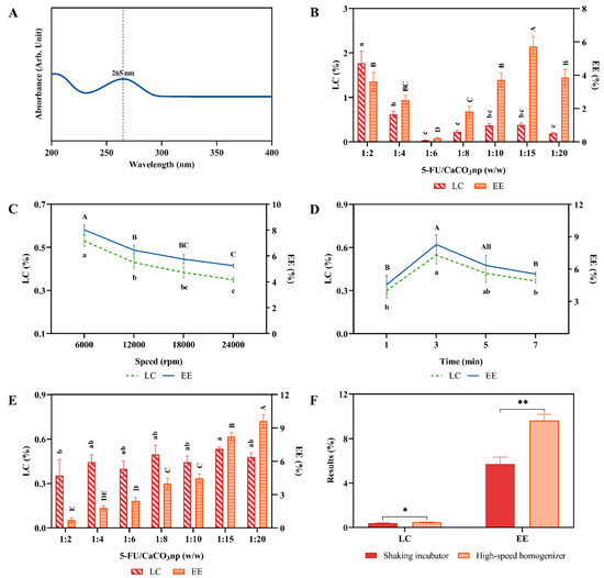 (A) Absorption spectrum of 5-FU with the absorbance peak (265 nm) in deionized water; (B) LC and EE of 5FU-CaCO3np at different weight ratios of 5-FU to CaCO3np when using the shaking incubator for 5-FU loading; (C) LC and EE of 5FU-CaCO3np at different speeds in the single-factor experiment; (D) LC and EE of 5FU-CaCO3np at different times in the single-factor experiment; (E) LC and EE of 5FU-CaCO3np at different weight ratios of 5-FU to CaCO3np when using the high-speed homogenizer for 5-FU loading; (F) comparison of the optimal loading results obtained using the shaking incubator and high-speed homogenizer. The results with the different superscripts (a–c and A–E nomenclature) indicate significant differences (p < 0.05). * p < 0.05, ** p < 0.01. LC, loading content; EE, encapsulation efficiency.