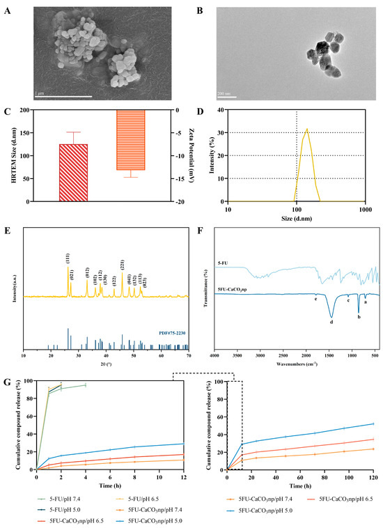 Surface morphology of 5FU-CaCO3np in (A) FESEM and (B) HRTEM; (C) size of 5FU-CaCO3np in HRTEM and surface charge; (D) hydrodynamic size of 5FU-CaCO3np; (E) XRD patterns of 5FU-CaCO3np and the reference diffraction peak (PDF#75-2230) of aragonite calcium carbonate nanoparticles from Inorganic Crystal Structure Database. The labels are the Miller indices planes (characteristic peaks of aragonite phase); (F) FTIR spectra of 5FU-CaCO3np and 5-FU. The labeled peaks (a–e) that represent peak assignments are stated in Table 2; (G) in vitro drug release profiles of 5FU-CaCO3np and 5-FU in PBS with 1% (v/v) Tween 80 at 37 °C and pH 7.4, 6.5, and 5.0. FESEM, field-emission scanning electron microscopy; HRTEM, high-resolution transmission electron microscopy; XRD, X-ray diffraction; FTIR, Fourier transform infrared spectroscopy; PBS, phosphate-buffered saline.