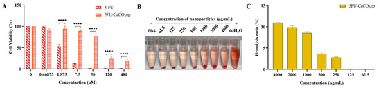 The red blood cells (erythrocytes) were collected from plasma by centrifuging at 3000 rpm for hemocompatibility analysis. The erythrocytes were redispersed in the PBS to prepare a 4% solution. The dispersed blood was added to a 5FU-CaCO3np aliquot with different concentrations (62.5–4000 μg/mL, in deionized water) and incubated for 1 h at 37 °C. Subsequently, the mixed samples were centrifuged, and the supernatant was analyzed at 540 nm by a microplate reader. The PBS solution and deionized water were used as negative (0% hemolysis) and positive control (100% hemolysis), respectively. The hemolysis percentage was calculated with the following equation:
