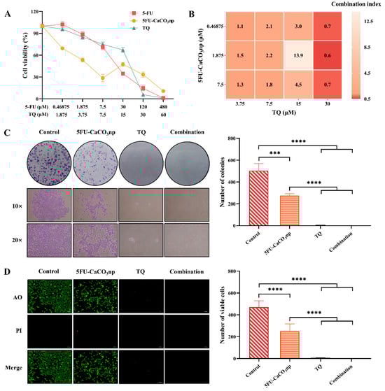 (A) Cytotoxicity of 5-FU (5-FU concentrations: 0–480 μM), 5FU-CaCO3np (5-FU concentrations: 0–480 μM), and TQ (TQ concentrations: 0–60 μM) on CT26 cells for 96 h; (B) combination index heat map of 5FU-CaCO3np and TQ in combination against CT26 cells; (C) colony formation assay on CT26 cells treated with 5FU-CaCO3np (1.875 μM) and TQ (30 μM) alone or in combination, with the represented images under 10× and 20× magnification; (D) AO/PI staining assay on CT26 cells treated with 5FU-CaCO3np (1.875 μM) and TQ (30 μM) alone or in combination, with the represented images showing viable cells revealed by AO staining in green and non-viable cells revealed by PI staining in red. *** p < 0.001, **** p < 0.0001.