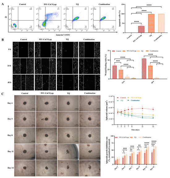 (A) Annexin V-FITC assay on CT26 cells treated with 5FU-CaCO3np (1.875 μM) and TQ (30 μM) alone or in combination, with the represented images depicting cells in different quadrants: necrosis (Q1), late apoptosis (Q2), early apoptosis (Q3), and live (Q4), where Q2 and Q3 are collectively called apoptotic cells; (B) wound healing assay on CT26 cells treated with 5FU-CaCO3np (1.875 μM) and TQ (30 μM) alone or in combination, with the represented images showing cell migration after 24 and 48 h; (C) growth inhibition analysis of CT26 spheroids treated with 5FU-CaCO3np (1.875 μM) and TQ (30 μM) alone or in combination, with the represented images displaying the spheroid volume and growth inhibition. * p < 0.05, ** p < 0.01, *** p < 0.001, **** p < 0.0001.