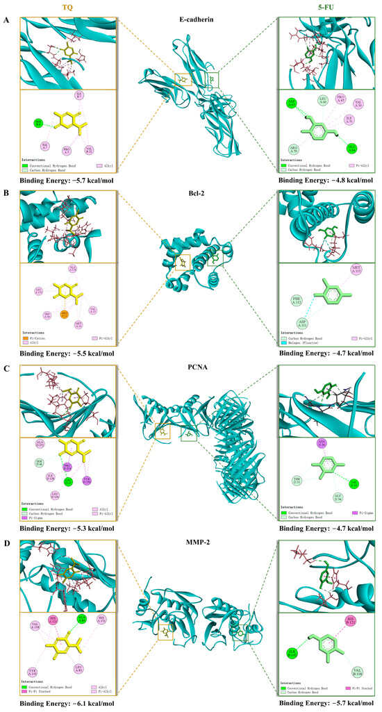 Schematic diagram of molecular docking between 5-FU/TQ and (A) E-cadherin, (B) Bcl-2, (C) PCNA, and (D) MMP-2.